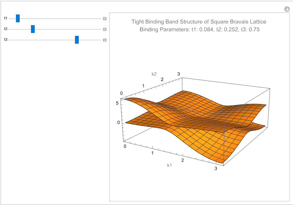 My program takes as input 3 binding parameters which represent the interactions between atoms in the lattice. It produces a visualization of the electronic band structure, that's manipulable and updates in real time as a user adjusts the binding parameters. My model's advantage is this interactivity which facilitates analysis and develops intuition for the workings of lattice band structures.