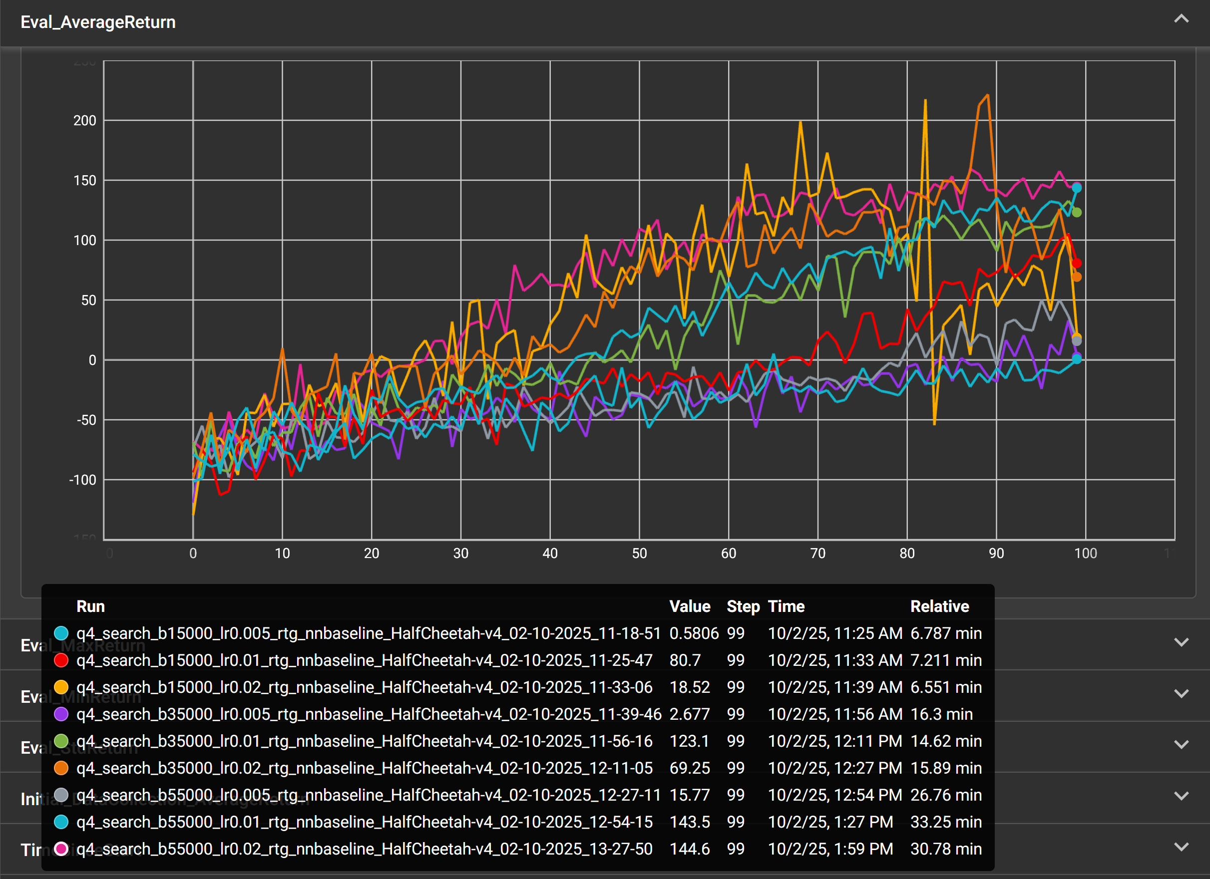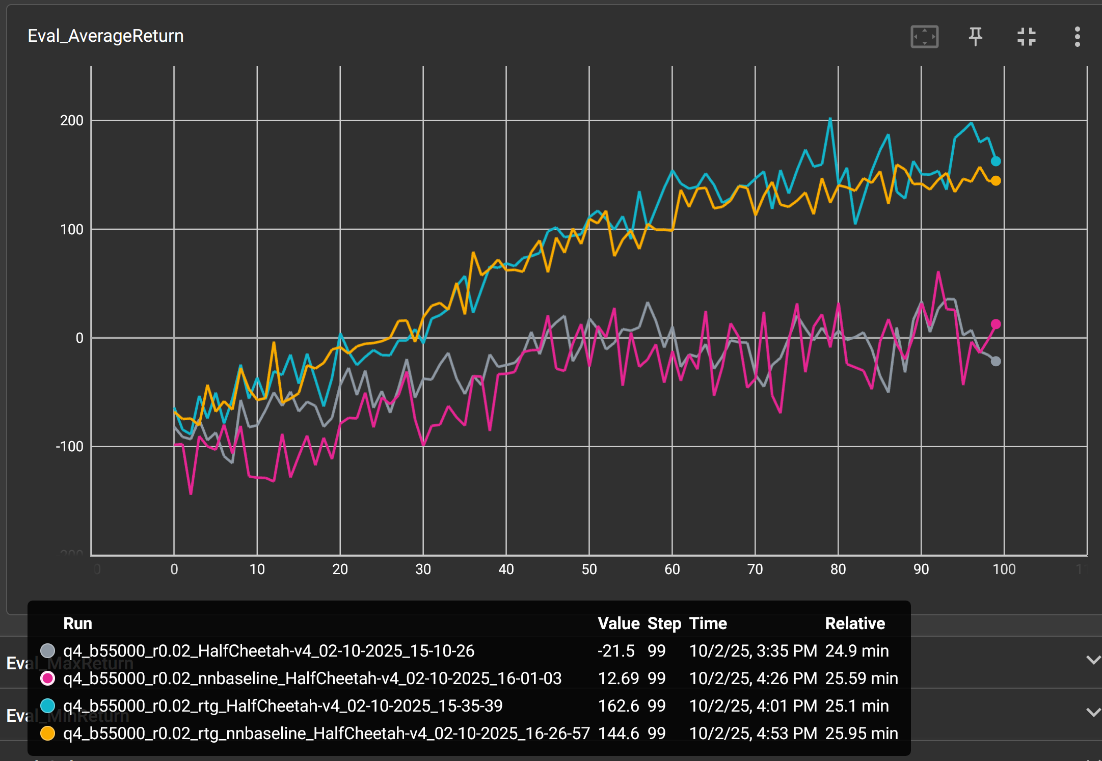 I conducted four training runs of batch size 10000, and learning rate 0.02. Two used a value function baseline (nnbaseline) and two used reward-to-go rewards (RTG).