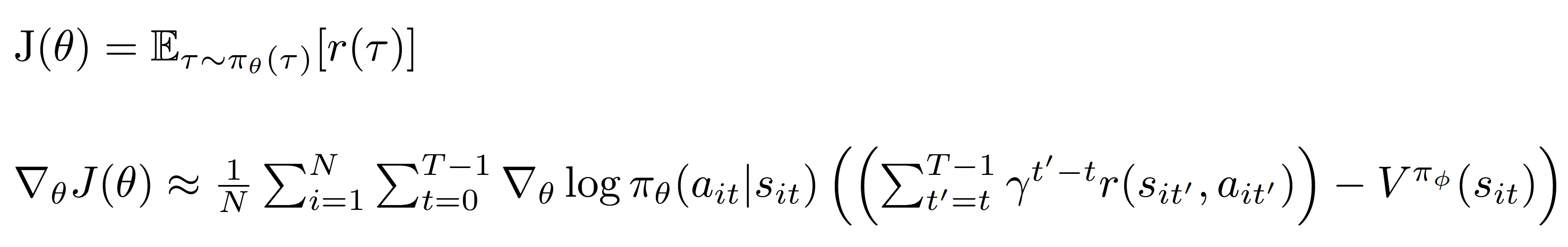 In the equation below, J is the expected reward we seek to optimize, and delJ is the gradient step we take to maximize it.